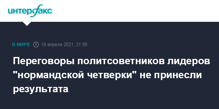 Москва. 19 апреля. INTERFAX.RU - Политические советники лидеров стран "Нормандской четверки" на видеоконференции в понедельник затронули лишь вопрос соблюдения перемирия на линии соприкосновения в Донбассе, но конкретных договоренностей не достигли.