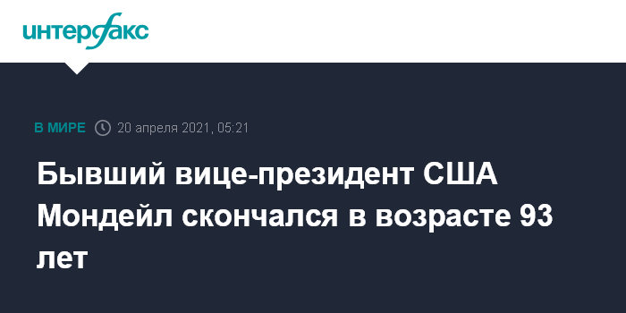 Москва. 20 апреля. INTERFAX.RU - Бывший вице-президент США Уолтер Мондейл умер в понедельник в возрасте 93 лет, сообщают американские СМИ.