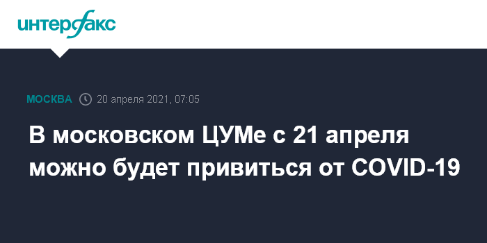 "Уже с завтрашнего дня, 21 апреля, сделать прививку против COVID-19 можно будет в ЦУМе. Практика показывает, что проходить вакцинацию москвичи предпочитают именно в таких точках. К примеру, в ГУМе прививку сделали уже более 15,5 тысячи человек", - сказала заммэра.