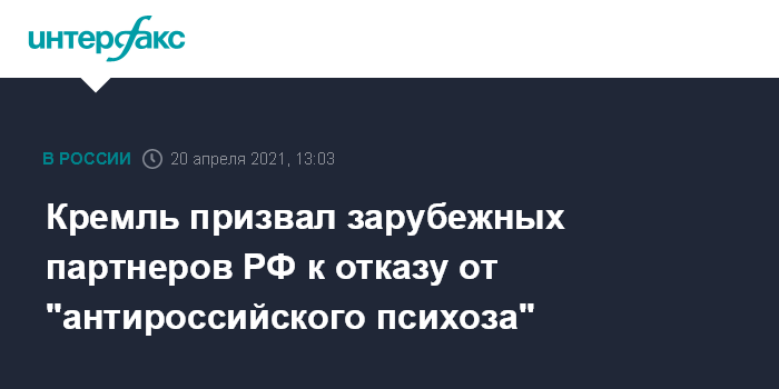 Москва. 20 апреля. INTERFAX.RU - В России призывают зарубежных партнеров к отказу от "массового антироссийского психоза" и конструктивному диалогу, заявил пресс-секретарь президента РФ Дмитрий Песков.