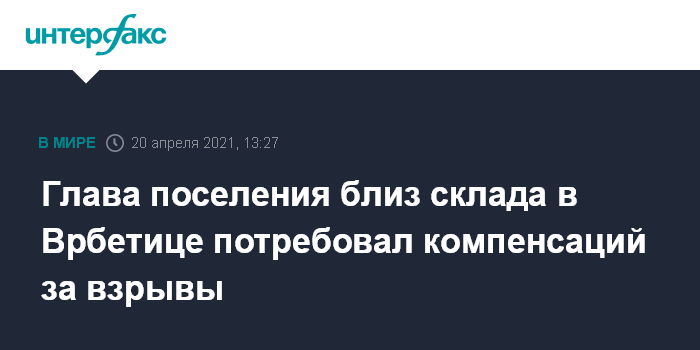 Москва. 20 апреля. INTERFAX.RU - Глава населенного пункта Славичин, рядом с которым в 2014 году произошли взрывы на складе боеприпасов в Врбетице, потребовал от правительства Чехии компенсаций, сообщает чешское радио. Томаш Хмел заявил, что жители Славичина имеют право на за нанесенный им ущерб.