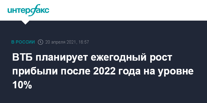 Москва. 20 апреля. INTERFAX.RU - ВТБ намерен вернуться к стратегическим целям по чистой прибыли в 2021 и 2022 годах, а после рассчитывает на ежегодный прирост на уровне не менее 10%, половину прибыли банк обещает направлять на дивиденды, заявил руководитель департамента стратегии и корпоративного развития банка Владимир Левыкин.