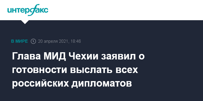 Москва. 20 апреля. INTERFAX.RU - Глава МИД Чехии Ян Гамачек заявил, что готов ко всему в отношениях Праги и Москвы, в том числе полностью их перезапустить, что подразумевает высылку всех российских дипломатов. Он написал об этом в фейсбуке.