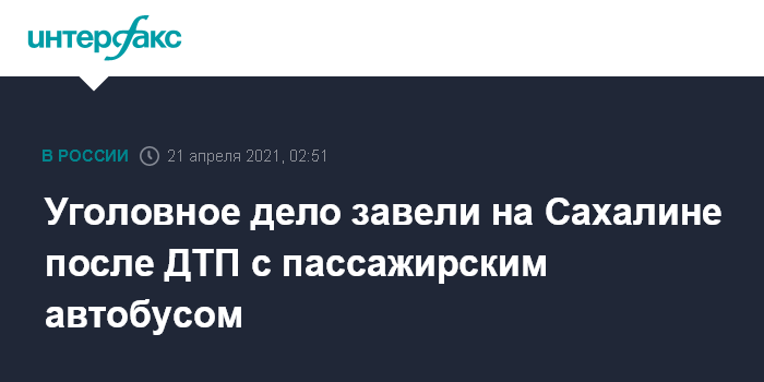 Москва. 21 апреля. INTERFAX.RU - Уголовное дело возбудили следователи по факту произошедшего 19 апреля недалеко от Южно-Сахалинска дорожно-транспортного происшествия с пассажирским автобусом, в котором пострадали 11 человек, сообщает пресс-служба следственного управления СКР по Сахалинской области.