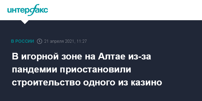 Москва. 21 апреля. INTERFAX.RU - ООО "Золотая ласточка 8" приостановило строительство развлекательного комплекса с казино в игорной зоне "Сибирская монета" в Алтайском крае из-за пандемии коронавируса. Об этом сообщил начальник краевого управления по развитию туризма и курортной деятельности Евгений Дешевых.