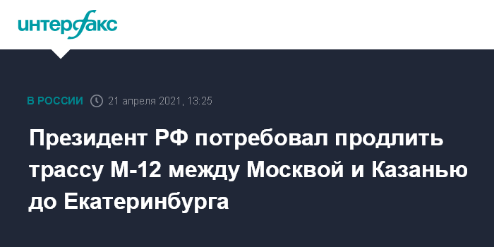 Москва. 21 апреля. INTERFAX.RU - Строящаяся скоростная платная автомагистраль М-12 от Москвы до Казани должна быть продлена до Екатеринбурга уже к 2024 году, на что, в том числе, будут привлечены средства ФНБ, заявил президент РФ Владимир Путин в ходе оглашения послания Федеральному собранию в среду.