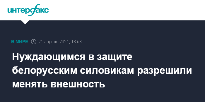 Москва. 21 апреля. INTERFAX.RU - Белорусские сенаторы одобрили в среду поправки в закон "О государственной защите судей, должностных лиц правоохранительных и контролирующих (надзорных) органов, сотрудников органа государственной охраны", теперь при необходимости силовикам, судьям, журналистам будут менять внешность и предоставлять телохранителей.