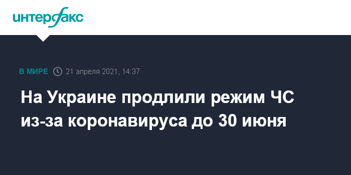 Москва. 21 апреля. INTERFAX.RU - Кабинет министров Украины продлевает режим чрезвычайной ситуации из-за коронавируса до 30 июня, сообщил премьер-министр Денис Шмыгаль в телеграм-канале в среду.