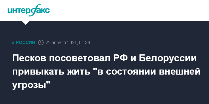 Москва. 22 апреля. INTERFAX.RU - Белоруссии и России нужно привыкнуть жить в состоянии внешней угрозы, заявил пресс-секретарь президента РФ Дмитрий Песков в эфире телеканала "Беларусь 1".
