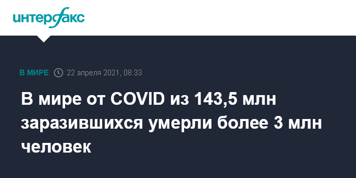 В мире от COVID из 143,5 млн заразившихся умерли более 3 млн человек