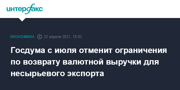 Москва. 22 апреля. INTERFAX.RU - Госдума по поручению президента упростит условия работы для несырьевых экспортеров. Это потребует отменить с 1 июля 2021 года установленное законом о валютном регулировании ограничение по возврату валютной выручки для несырьевого экспорта, заявил на заседании первый вице-спикер палаты Александр Жуков.