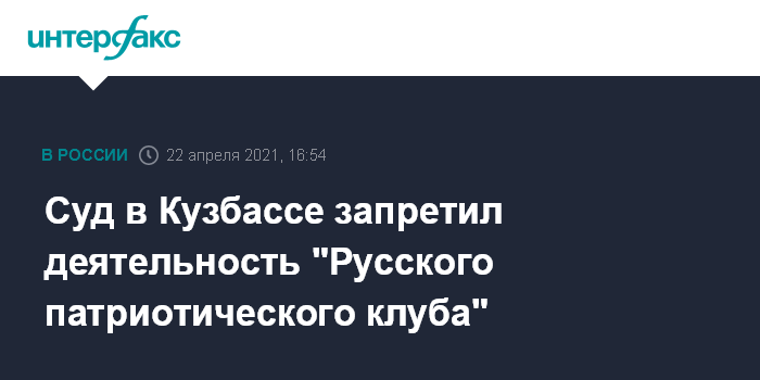 Москва. 22 апреля. INTERFAX.RU - Кемеровский областной суд отклонил апелляцию общественного объединения "Русский патриотический клуб - Новокузнецк/РПК" на решение о признании экстремистским и запрете его деятельности в России, сообщает портал "МВД Медиа" со ссылкой на пресс-службу регионального управления МВД.