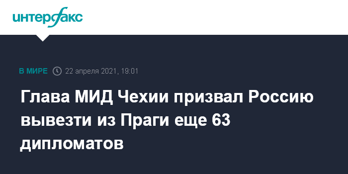 22 апреля на брифинге глава МИД Чехии сообщил о решении властей страны уравнять число представителей персонала в посольстве России в Чехии до уровня представительства в чешском посольстве в Москве. Российские дипломаты должны выехать из Праги до конца мая.