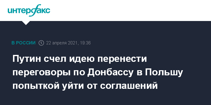 Москва. 22 апреля. INTERFAX.RU - Предложения Киева о переносе переговоров по урегулированию в Донбассе из Минска являются попыткой уклониться от решения конфликта на юго-востоке Украины, считает президент РФ Владимир Путин.