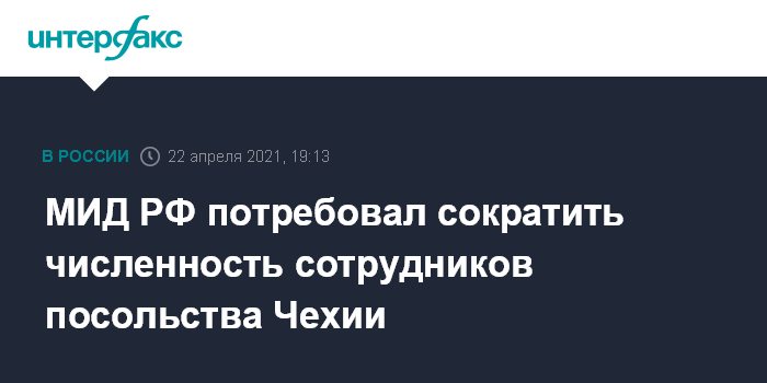 Москва. 22 апреля. INTERFAX.RU - Россия в связи с последними действиями Праги требует от чешской стороны сократить количество сотрудников посольства Чехии в Москве, оставляет право на дальнейшие шаги, заявили в МИД РФ.