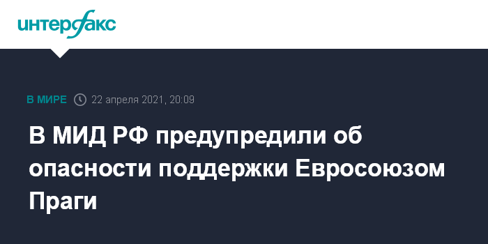 Москва. 22 апреля. INTERFAX.RU - Линия Евросоюза на поддержку Чехии опасна, в Москве исходят из того, что Брюссель отдает себе отчет о ее последствиях, заявила в четверг официальный представитель МИД РФ Мария Захарова.