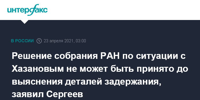 "Я тоже озабочен (задержанием Хазанова), поскольку я работал вместе, но я считаю, что наше собрание по этому поводу не должно принимать решение до тех пор, пока мы не разобрались", - сказал Сергеев на прошедшем в среду общем собрании РАН.