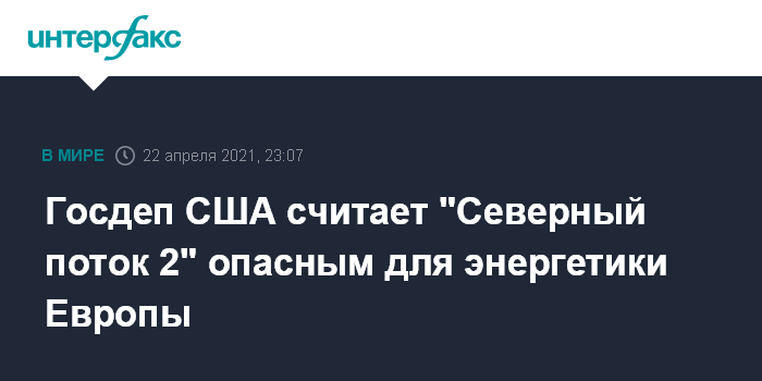 Москва. 22 апреля. INTERFAX.RU - Администрация США расценивает проект газопровода "Северный поток 2" как опасный для энергетической безопасности Европы и продолжит предпринимать меры против его завершения, заявил в четверг представитель госдепа Нед Прайс.