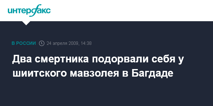 Лондон. 24 апреля. INTERFAX.RU - Не менее 25 человек погибли в пятницу в результате двойного теракта, организованного смертниками у шиитского мавзолея в Багдаде, передает со ссылкой на местную полицию британская телерадиокорпорация BBC.