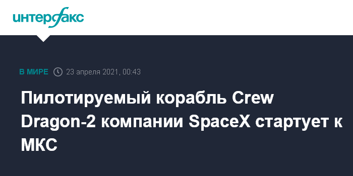 Москва. 23 апреля. INTERFAX.RU - Космический корабль Crew Dragon-2 компании SpaceX с четырьмя астронавтами на борту в пятницу стартует к Международной космической станции (МКС), сообщает NASA.