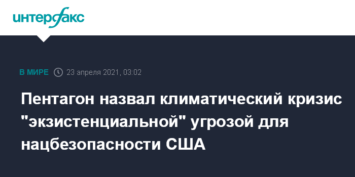 Москва. 23 апреля. INTERFAX.RU - Министр обороны Соединенных Штатов Ллойд Остин назвал изменение климата "экзистенциальной" угрозой национальной безопасности США.