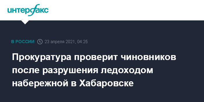 Москва. 23 апреля. INTERFAX.RU - Прокуратура Хабаровского края начала проверку после того как ледяные глыбы в четверг разрушили один из участков на набережной реки Амур в центре Хабаровска, сообщает ведомство в пятницу.