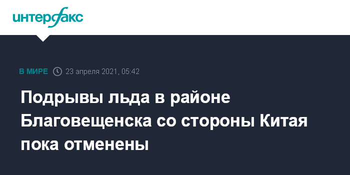 Москва. 23 апреля. INTERFAX.RU - Китайская сторона отложила запланированные на пятницу подрывы льда на трансграничной реке Амур в районе грузового порта Хэйхэ, который расположен напротив столицы Амурской области - Благовещенска, сообщает Амурский центр гражданской защиты и пожарной безопасности (ГЗ и ПБ).