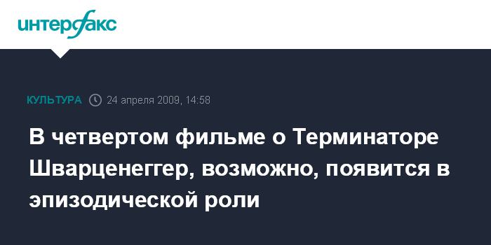 Москва. 24 апреля. INTERFAX.RU - Губернатор Калифорнии Арнольд Шварценеггер может сыграть эпизодическую роль в новом фильме о Терминаторе.