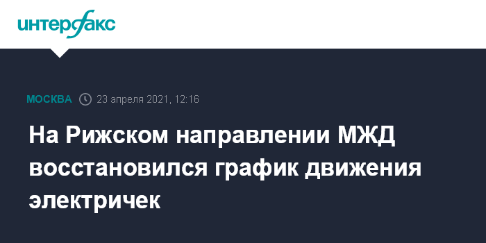 Москва. 23 апреля. INTERFAX.RU - Штатный режим движения электропоездов на Рижском направлении МЖД восстановлен, сообщили в пресс-службе Московской железной дороги.