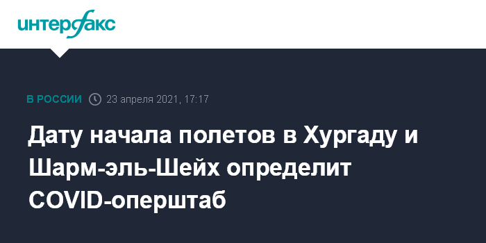 Москва. 23 апреля. INTERFAX.RU - Решение об открытии авиасообщения с курортами Египта и о количестве рейсов в Хургаду и Шарм-эль-Шейх во второй половине мая примет федеральный оперштаб по борьбе с коронавирусом. Об этом сообщил сам оперштаб.