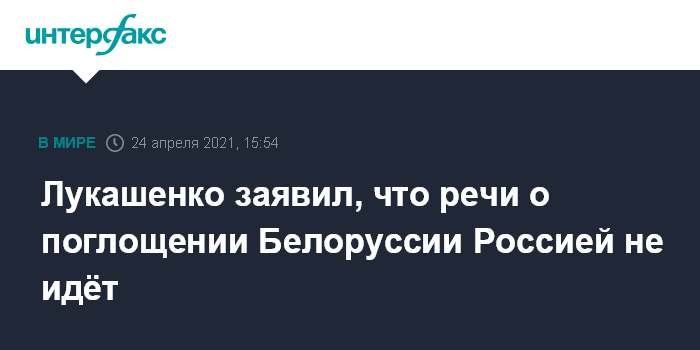 Москва. 24 апреля. INTERFAX.RU - Президент Белоруссии Александр Лукашенко заявил, что рассуждения о возможности поглощения страны Россией не имеют под собой основания, и на переговорах с президентом РФ Владимиром Путиным эта тема не обсуждалась.