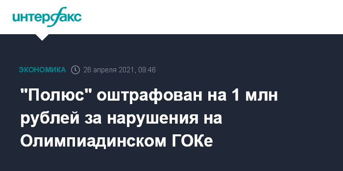 Москва. 26 апреля. INTERFAX.RU - Енисейское управление Ростехнадзора сообщило, что оштрафовало АО "Полюс Красноярск" (входит в группу ПАО "Полюс") в общей сложности на миллион рублей за нарушения при строительстве и реконструкции объектов Олимпиадинского ГОКа (Северо-Енисейский район).
