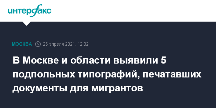 Москва. 26 апреля. INTERFAX.RU - ФСБ сообщает о ликвидации пяти подпольных типографий, печатавших документы для мигрантов в Московском регионе, по данному делу задержаны 16 человек.