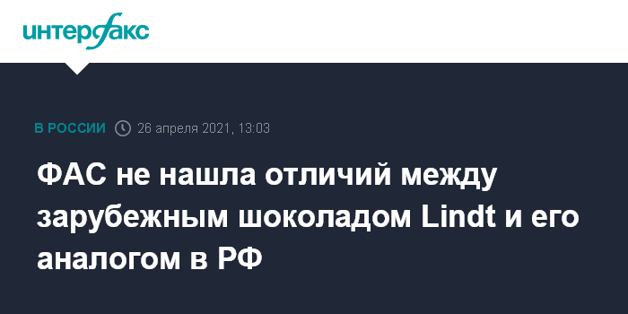 Москва. 26 апреля. INTERFAX.RU - Федеральная антимонопольная служба (ФАС) не нашла нарушений в действиях производителя шоколада Lindt, которого ранее заподозрила в нарушении закона о конкуренции из-за отличий продукции для российского рынка и других стран.