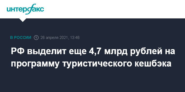Москва. 26 апреля. INTERFAX.RU - Вице-премьер Дмитрий Чернышенко сообщил, что правительство выделит 4,7 млрд рублей на продление до конца года программы кешбэка на туры по России.