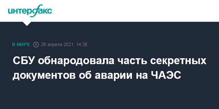 Москва. 26 апреля. INTERFAX.RU - Служба безопасности Украины по случаю 35-й годовщины катастрофы на Чернобыльской атомной электростанции обнародовала часть секретных документов из своих архивов, среди них - самый первый доклад о взрыве от директора ЧАЭС Виктора Брюханова и переговоры операторов станции в момент аварии.