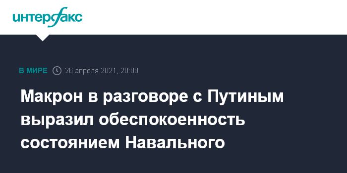 Москва. 26 апреля. INTERFAX.RU - Президент Франции Эммануэль Макрон в ходе телефонного разговора со своим российским коллегой Владимиром Путиным выразил обеспокоенность сообщениями о состоянии здоровья оппозиционера Алексея Навального, передают в понедельник французские СМИ со ссылкой на Елисейский дворец.