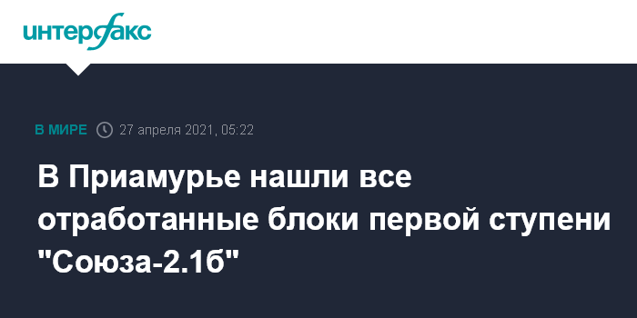 Москва. 27 апреля. INTERFAX.RU - Все четыре части боковых блоков первой ступени ракеты-носителя "Союз-2.1б", пуск которой состоялся в понедельник с космодрома "Восточный", найдены в тайге Амурской области, сообщил "Интерфаксу" начальник отдела Центра эксплуатации объектов наземной космической инфраструктуры (ЦЭНКИ, предприятие "Роскосмоса") Александр Двуреченский.