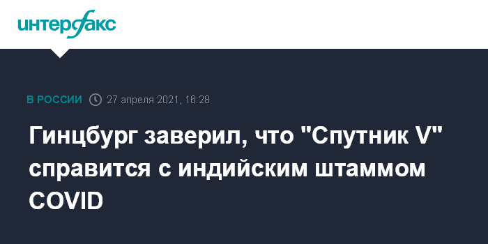 Москва. 27 апреля. INTERFAX.RU - Вакцина от коронавируса "Спутник V" эффективна против так называемого индийского штамма COVID-19, сообщил "Интерфаксу" глава центра имени Гамалеи Минздрава России Александр Гинцбург.