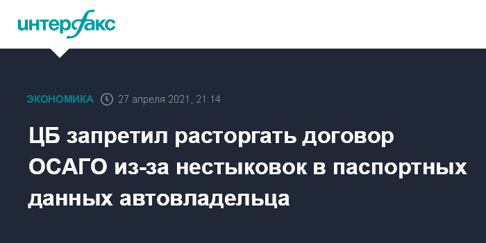 ЦБ запретил расторгать договор ОСАГО из-за нестыковок в паспортных данных автовладельца