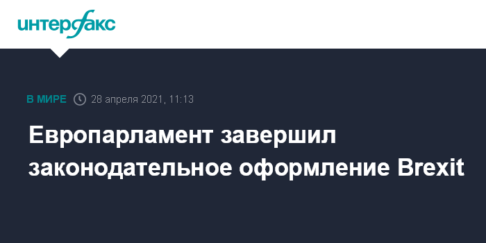 Москва. 28 апреля. INTERFAX.RU - Европейский парламент завершил законодательное оформление выхода Великобритании из Евросоюза (Brexit), утвердив Соглашение о торговле и сотрудничестве. Документ устанавливает правила будущих отношений между Лондоном и Брюсселем.