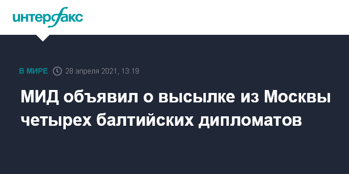 Москва. 28 апреля. INTERFAX.RU - Россия на основании принципа взаимности высылает двух сотрудников посольства Литвы в Москве и по одному сотруднику посольств Эстонии и Латвии, сообщил российский МИД. Им дали по семь дней на сборы.