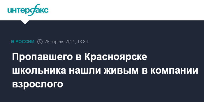 Москва. 28 апреля. INTERFAX.RU - Восьмилетнего школьника, пропавшего 27 апреля в Красноярске, нашли живым. Как сообщает пресс-служба СУ СКР по региону, школьника обнаружили в заброшенном доме в компании взрослого мужчины. Его личность установлена.