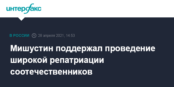 Москва. 28 апреля. INTERFAX.RU - Премьер Михаил Мишустин поддержал предложение КПРФ о законодательной проработке широкой репатриации соотечественников. Об этом сообщил председатель комитета Госдумы по делам СНГ, евразийской интеграции и связям с соотечественниками Леонид Калашников.