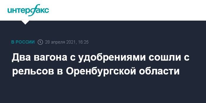 Москва. 28 апреля. INTERFAX.RU - Сход двух вагонов с удобрениями произошел в городе Кувандык (Оренбургская область), по предварительным данным, никто не пострадал. Об этом сообщает пресс-служба Уральской транспортной прокуратуры.