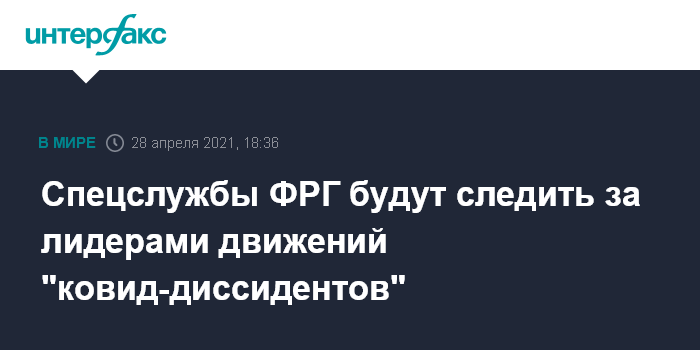 Москва. 28 апреля. INTERFAX.RU - Спецслужбы Германии займутся отслеживанием действий ведущих участников протестных движений, выступающих против введения ограничительных мер для борьбы с коронавирусом, сообщают в среду европейские СМИ со ссылкой на МВД ФРГ.