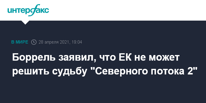 Москва. 28 апреля. INTERFAX.RU - Европейская комиссия не имеет возможности принимать решения о судьбе проекта газопровода "Северный поток 2", заявил в среду глава европейской дипломатии Жозеп Боррель.