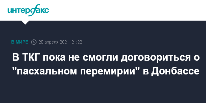 Москва. 28 апреля. INTERFAX.RU - Участникам Трехсторонней контактной группы (ТКГ) по Донбассу пока не удалось согласовать текст документа о введении "пасхального перемирия", однако стороны подтвердили необходимость продолжать консультации по согласованию документа, заявил представитель украинской делегации в ТКГ Алексей Арестович.