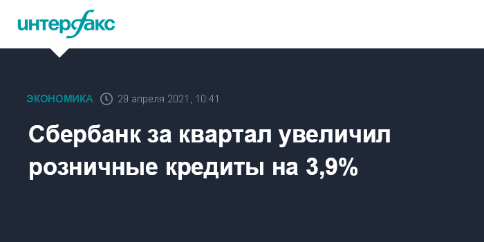 Москва. 29 апреля. INTERFAX.RU - В I квартале 2021 года Сбербанк увеличил розничные кредиты по МСФО на 3,9%, корпоративные - на 0,8%, говорится в сообщении банка.