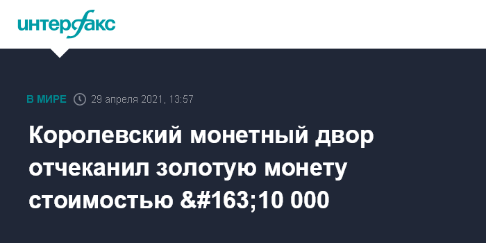 Москва. 29 апреля. INTERFAX.RU - Королевский монетный двор Великобритании выпустил золотую монету весом 10 кг и диаметром 20 см, которая имеет номинал £10 000. Об этом пишет The Guardian. Монета стала самой крупной за всю 1100-летнюю историю британского монетного двора. На ее изготовление ушло 400 часов, включая 4 дня полировки.
